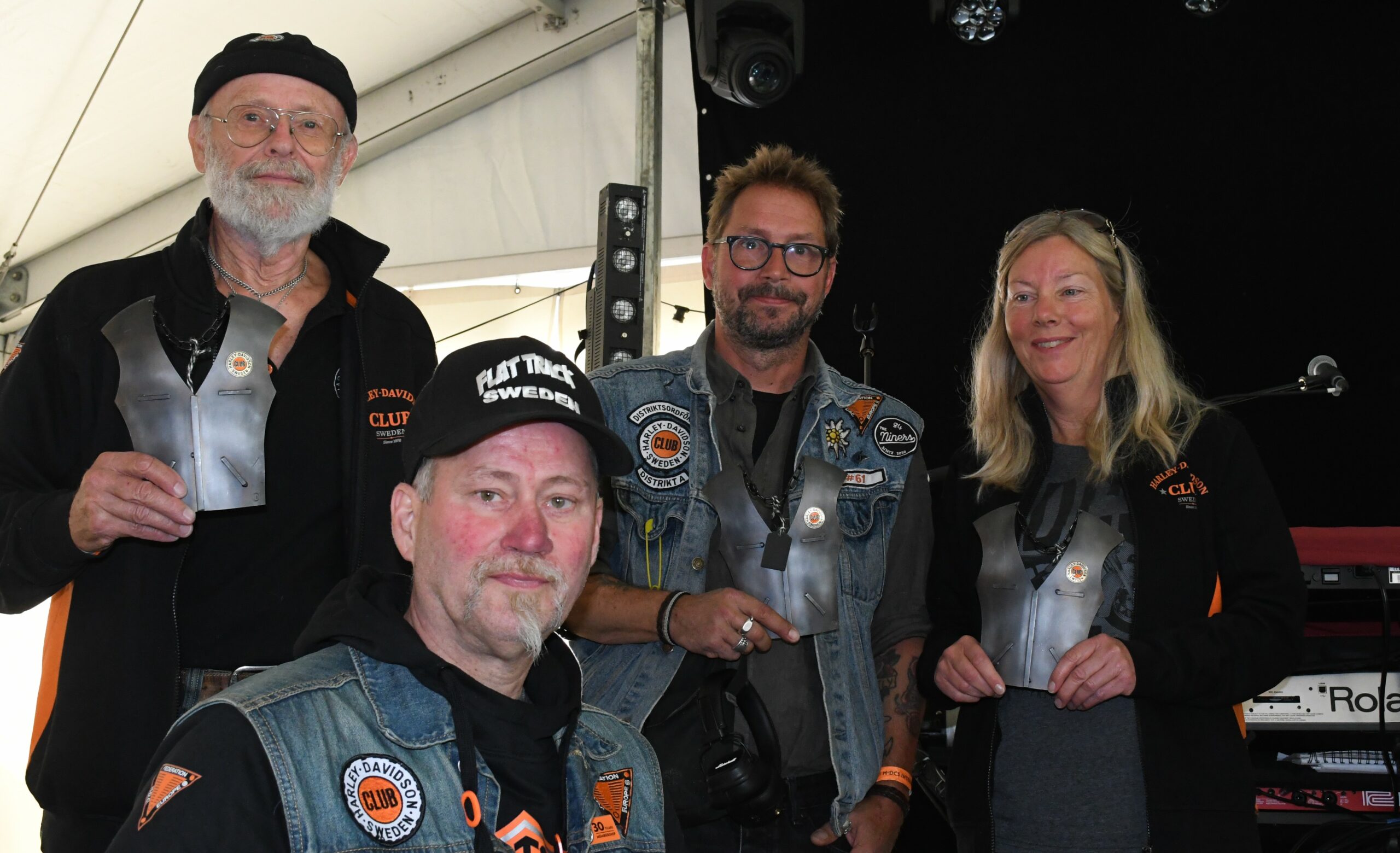 De som lämnade sina förtroendeposter hedrades med Jörgen Stjärnas konstfulla harnesk i form av miniplåtvästar. Bengt ”Benet” Sernbladh, Cecilia ”Cilla” Svensson, Lars Carlsson och Göran Axblad. DOK Marina Enback och avgående sekreterare Kenneth Taavo var inte på plats vid årets IT.