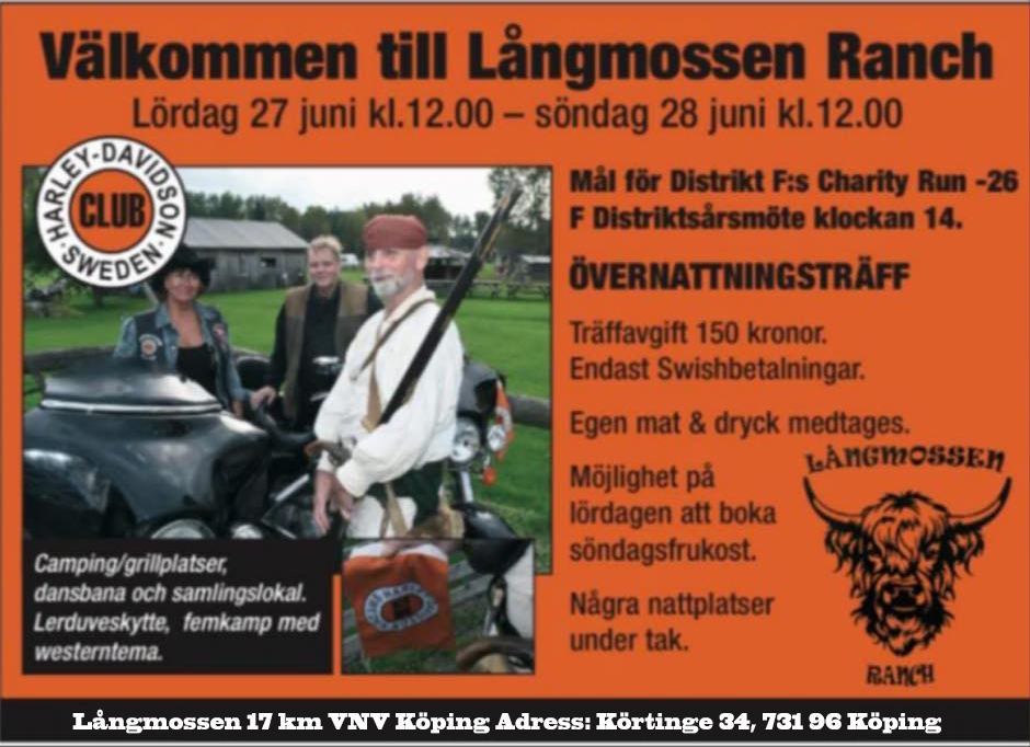 27-28/6 har vi i distrikt F distriktsårsmöte med övernattning på Långmossen Ranch i Körtinge som ligger 17 km väst nord väst om Köping.