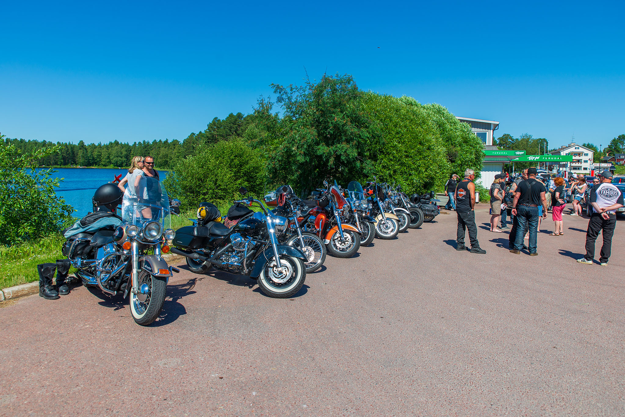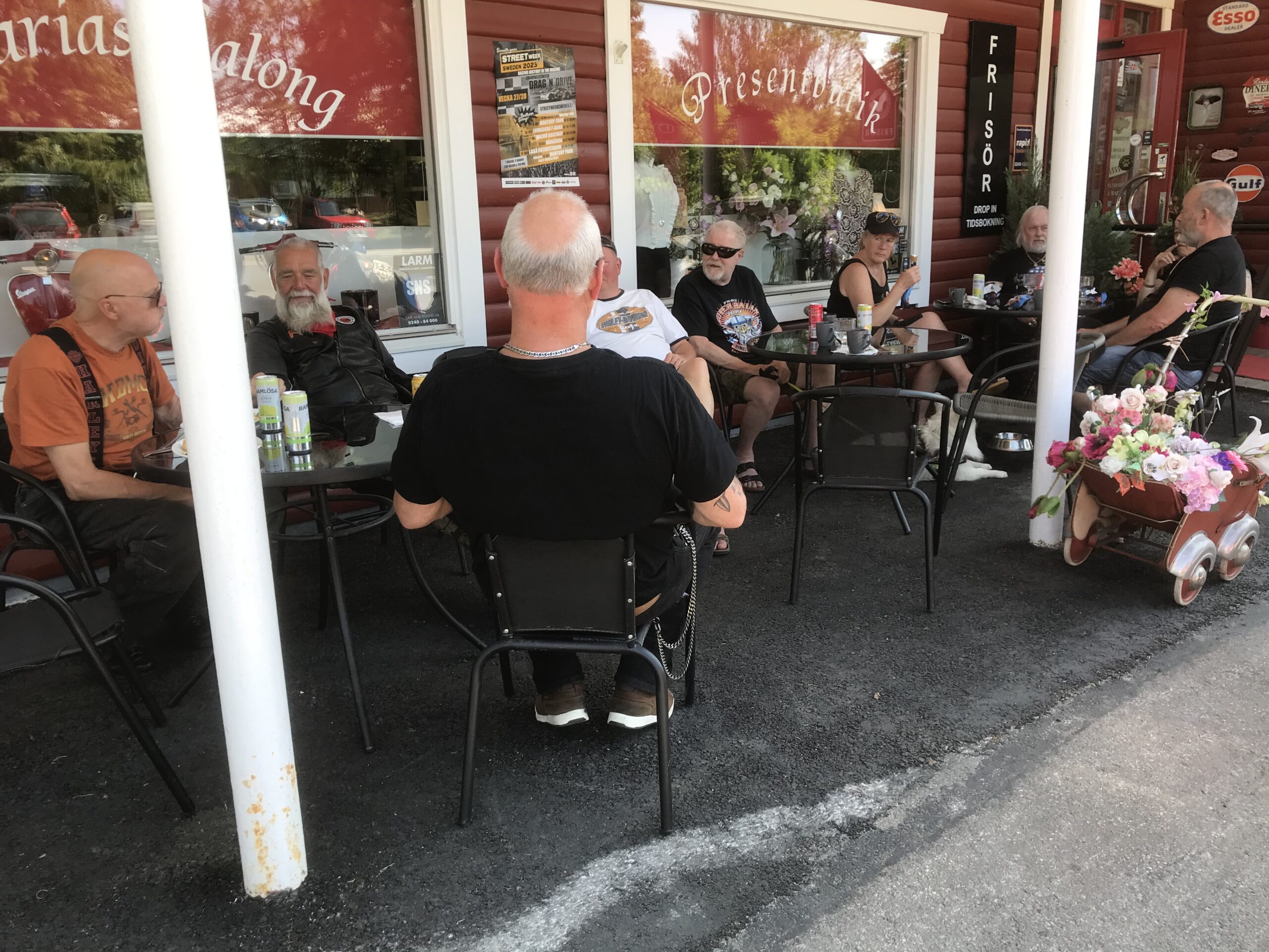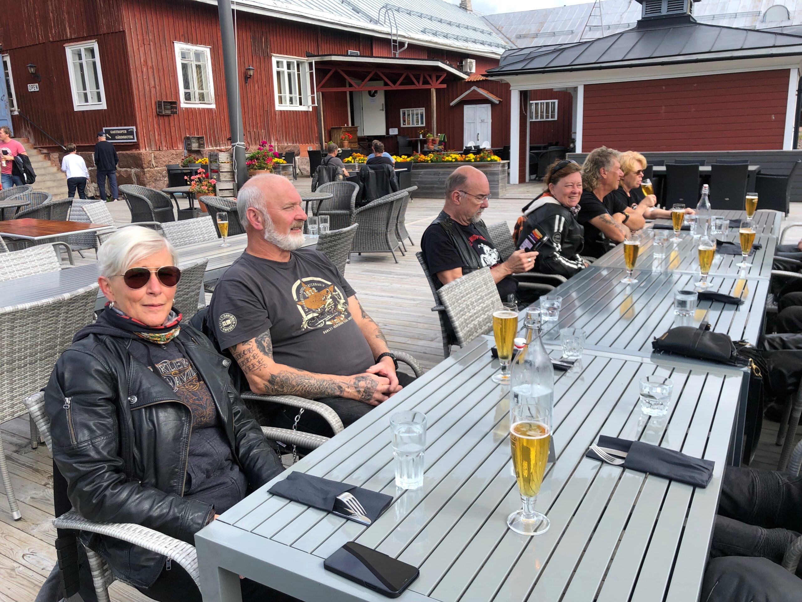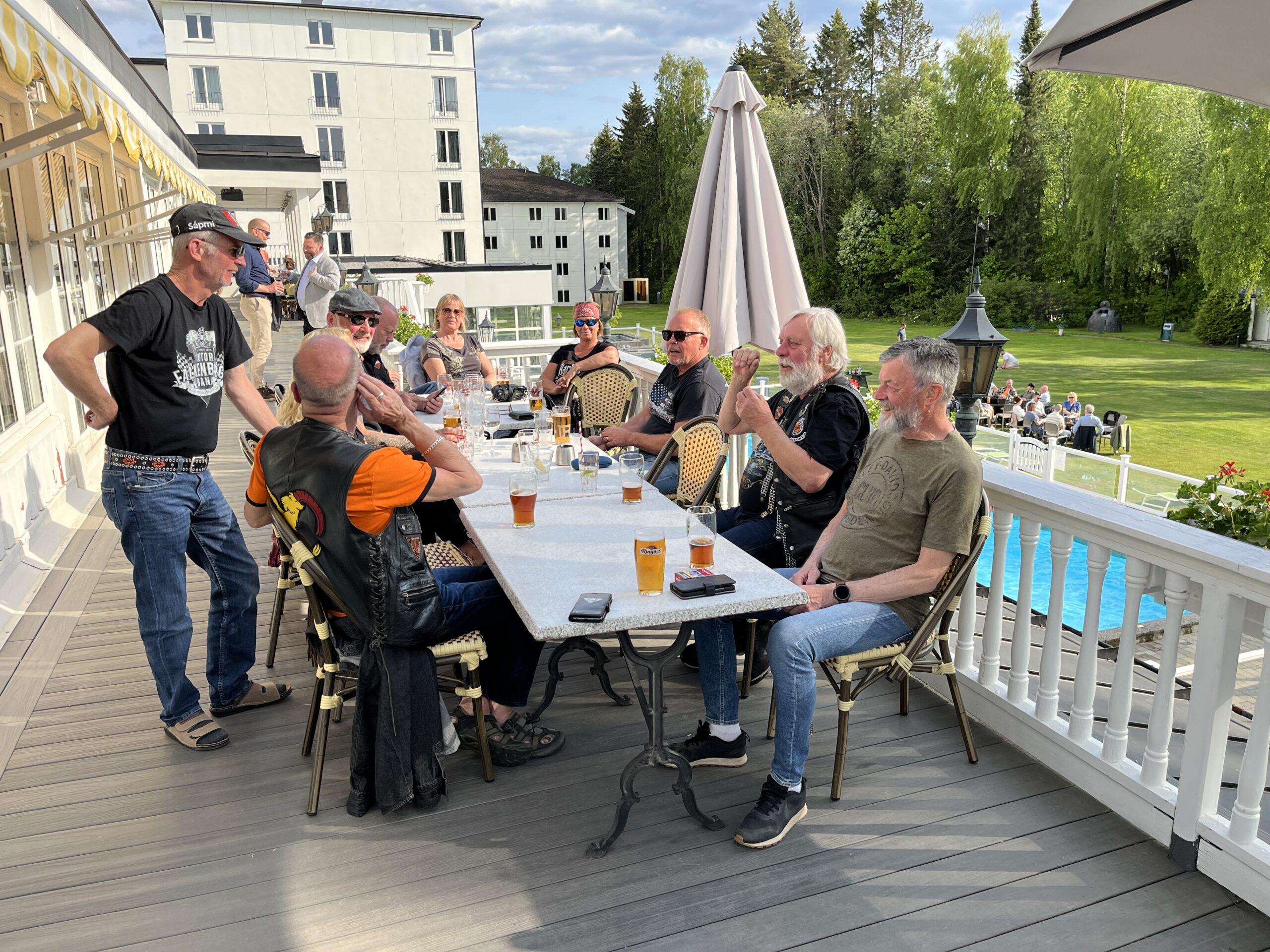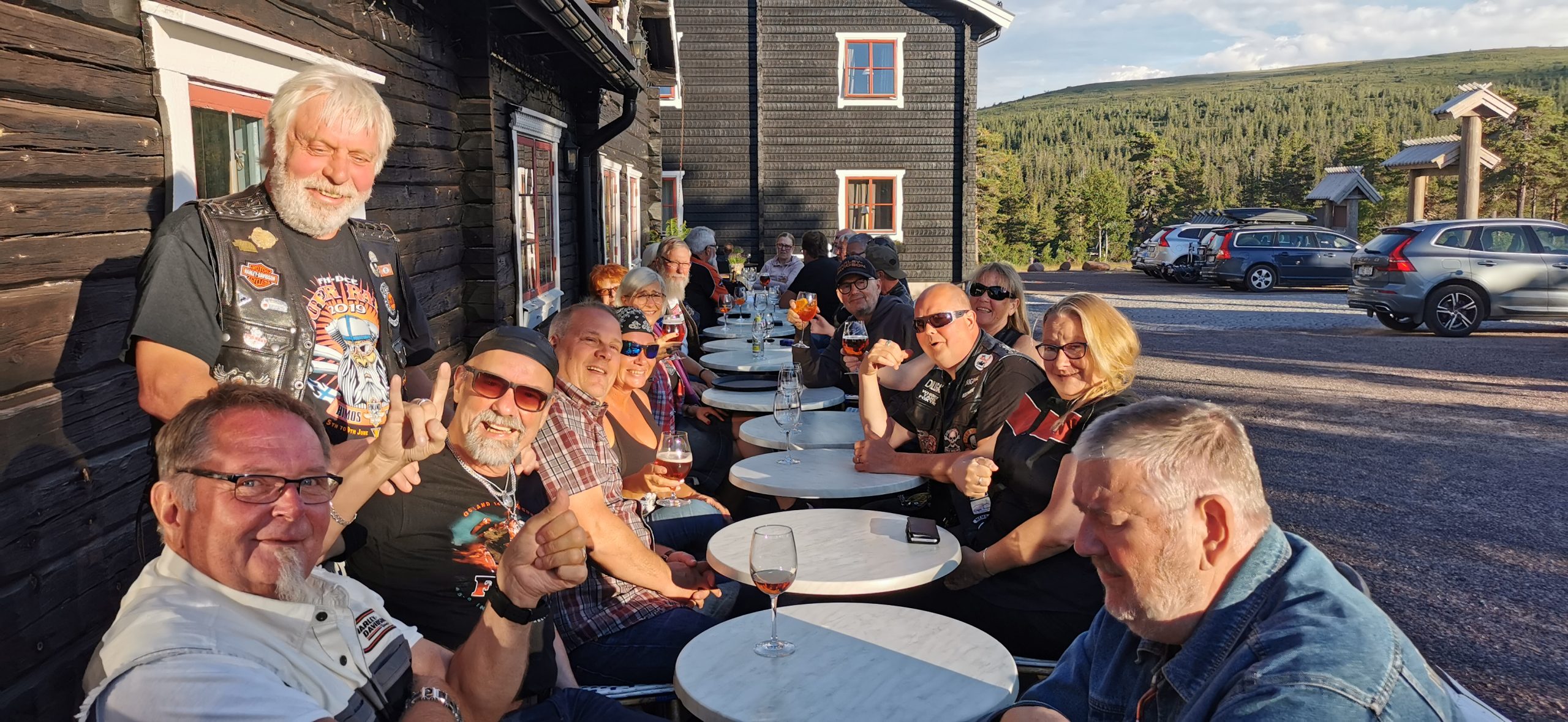 Dag två startade vi klockan halv tio och åkte vidare till Grangärde för en trevlig fikarast på Tillmans musteri i strålande solsken. Färde fortsatte sedan till Vansbro där vi åt lunch. I Vansbro räknade vi in 30 hojar, det har ökat på fast vi har tappat några under resan. Färden gick sedan vidare till Sälen och Gammelgården för övernattning.