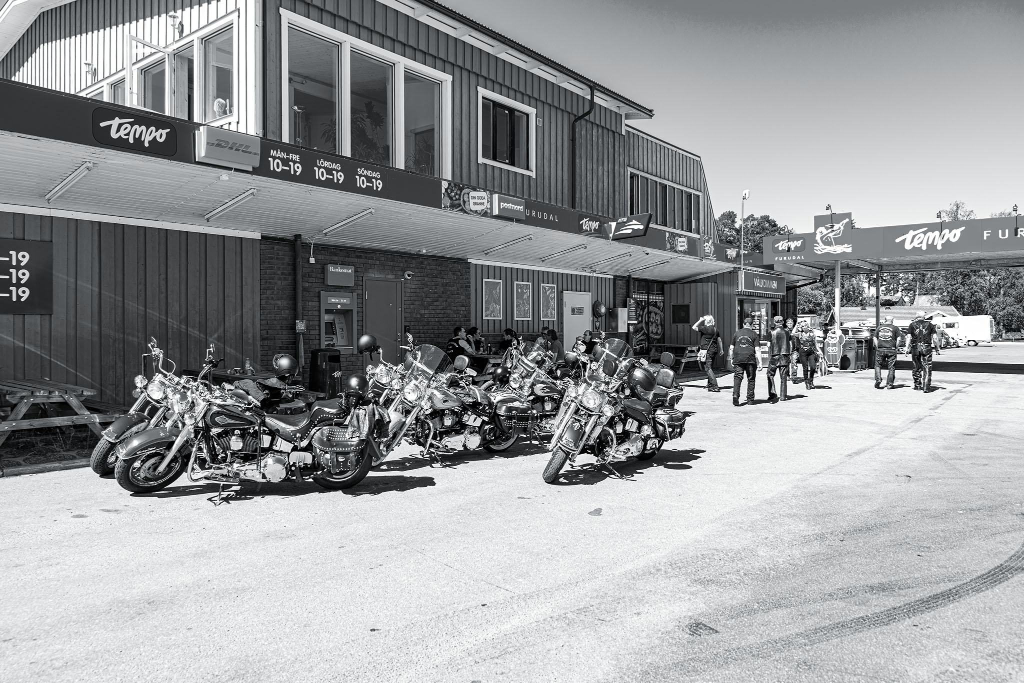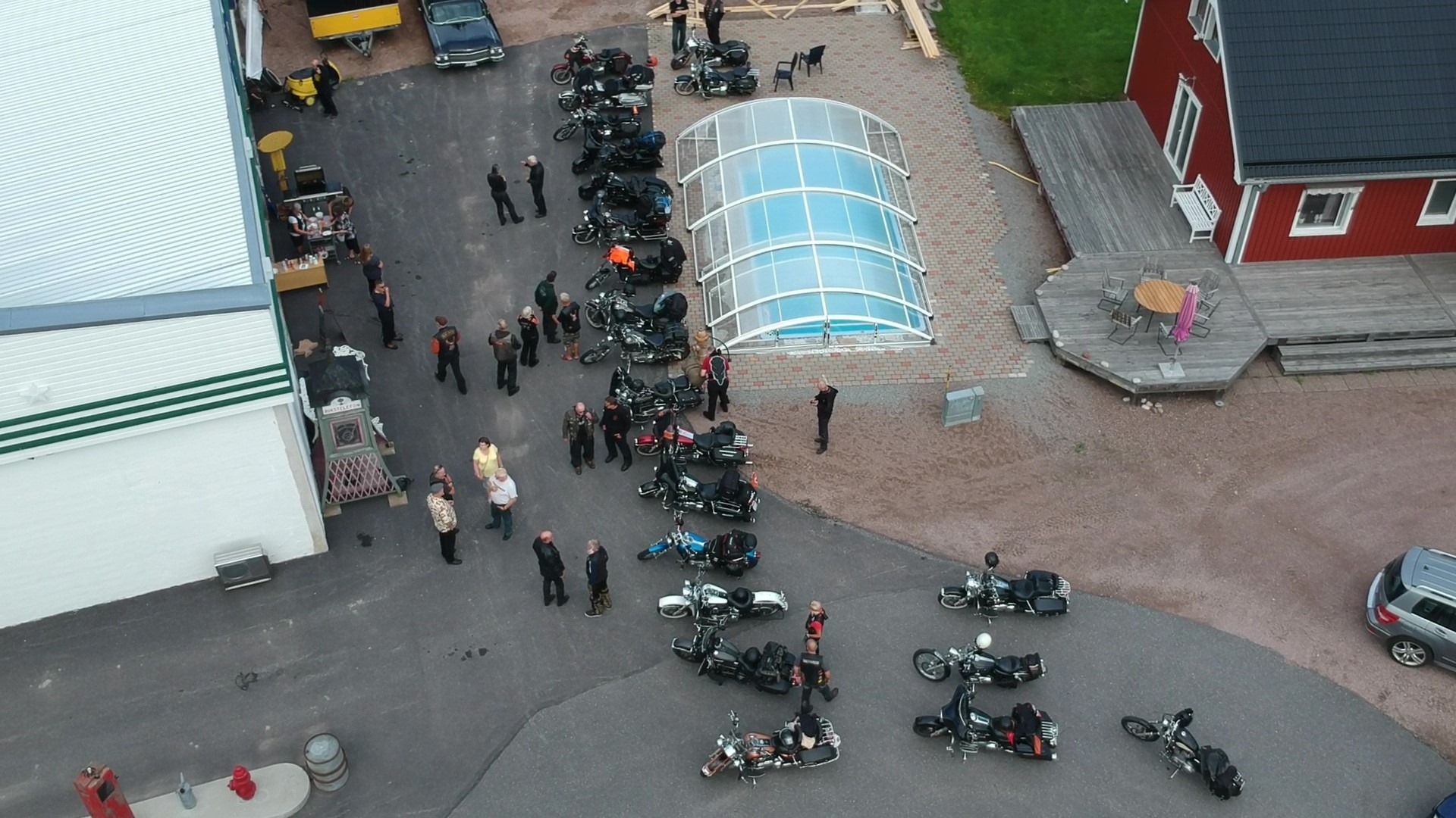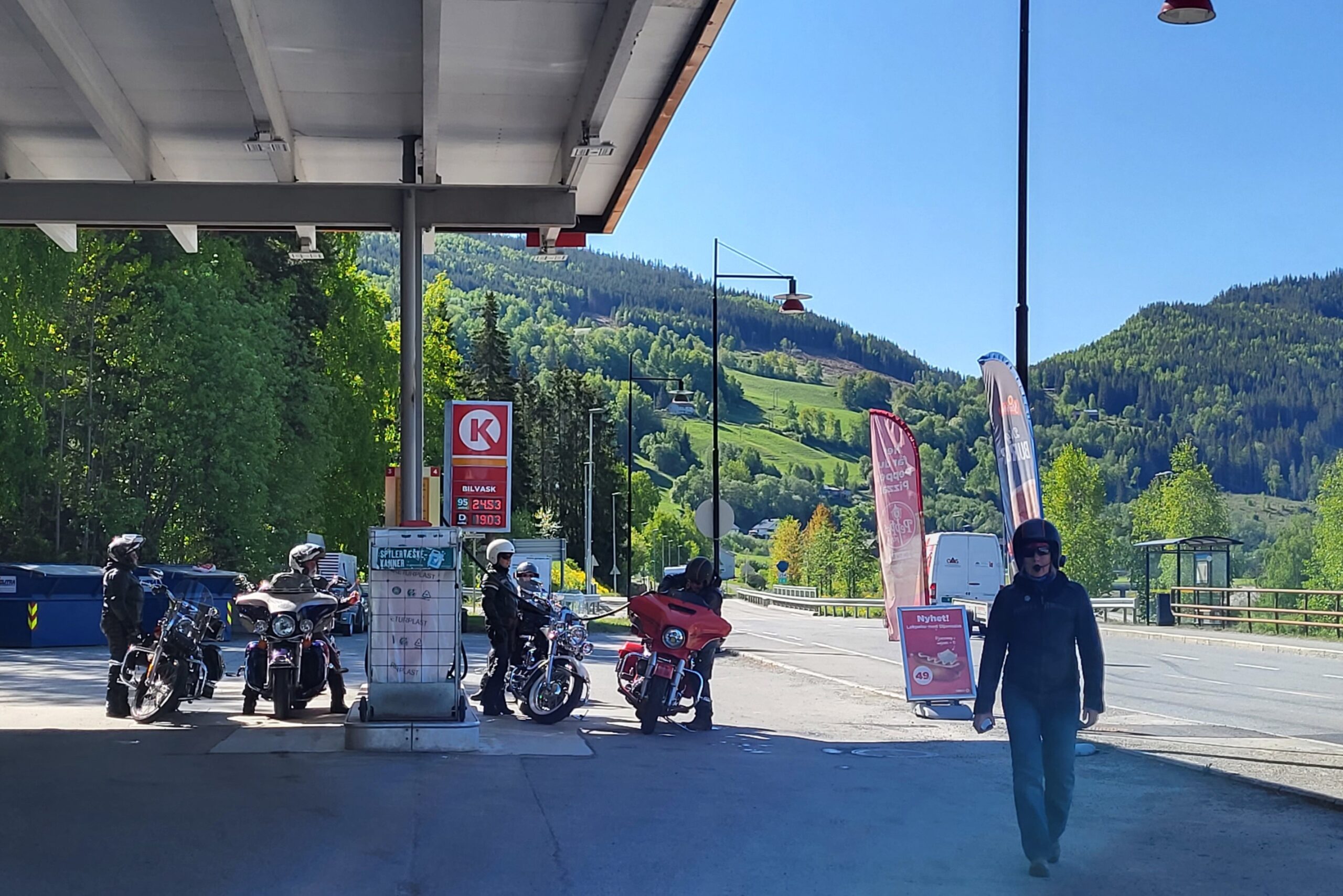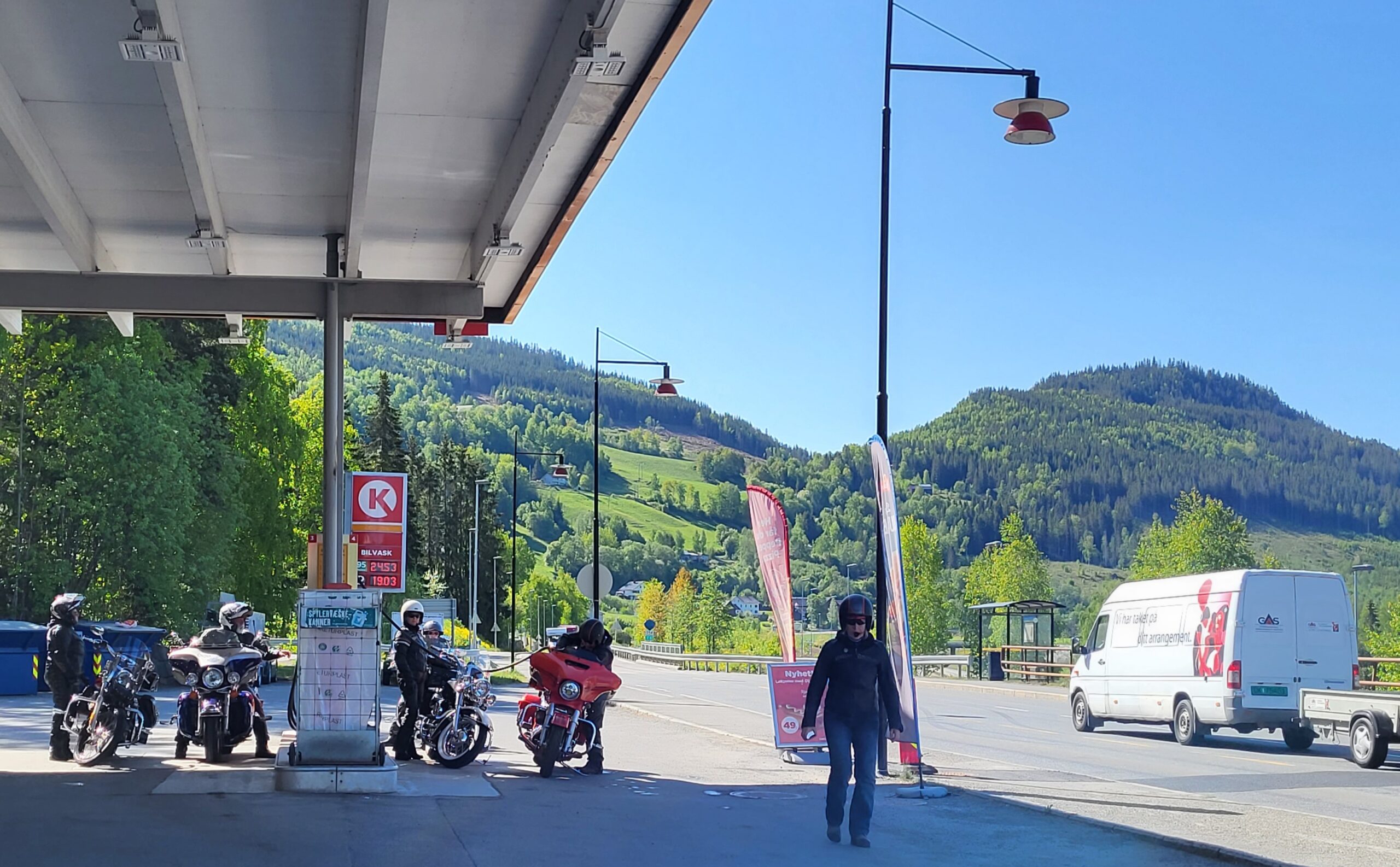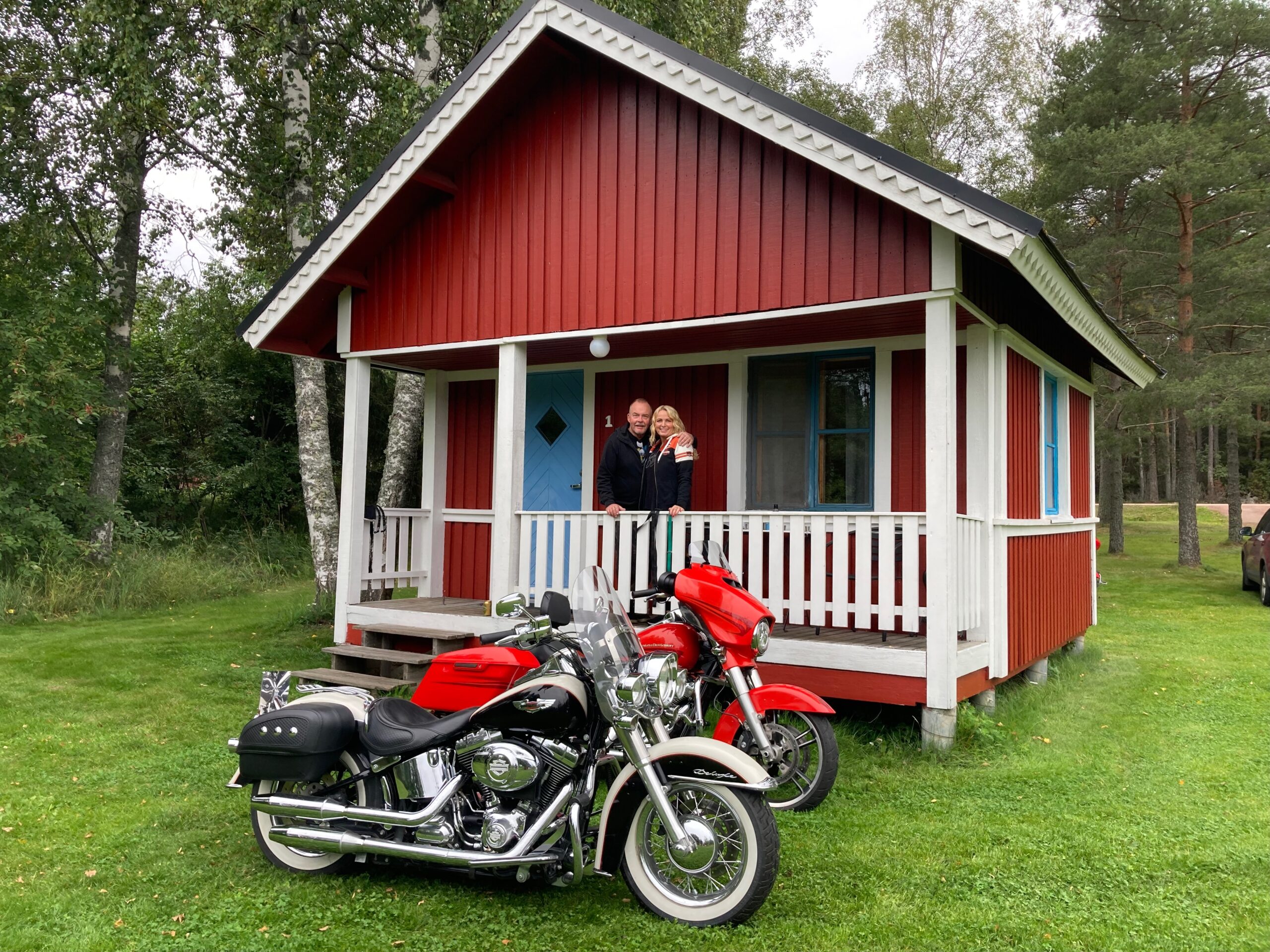 Dag två startade vi klockan halv tio och åkte vidare till Grangärde för en trevlig fikarast på Tillmans musteri i strålande solsken. Färde fortsatte sedan till Vansbro där vi åt lunch. I Vansbro räknade vi in 30 hojar, det har ökat på fast vi har tappat några under resan. Färden gick sedan vidare till Sälen och Gammelgården för övernattning.